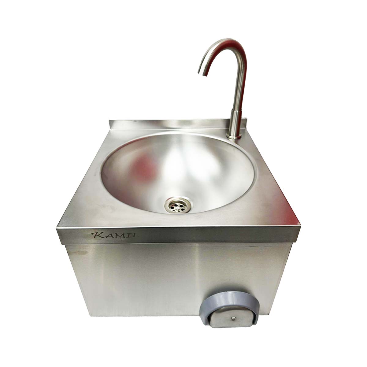 This completely hands free sink is operated by your knee, making it hygienic to use and germs from your hands don't get onto any taps or buttons, reducing cross contamination and increasing hygiene. Hands free sinks are perfect for use in environments where food contamination is likely, such as butchers or commercial kitchens. This stainless steel sink from KAMIL is a high quality and easy to clean sink. The hands free hand sink is made of durable 204 series stainless steel. A gooseneck faucet is pre-installed and it also includes a high backsplash. A must have for any catering establishment.