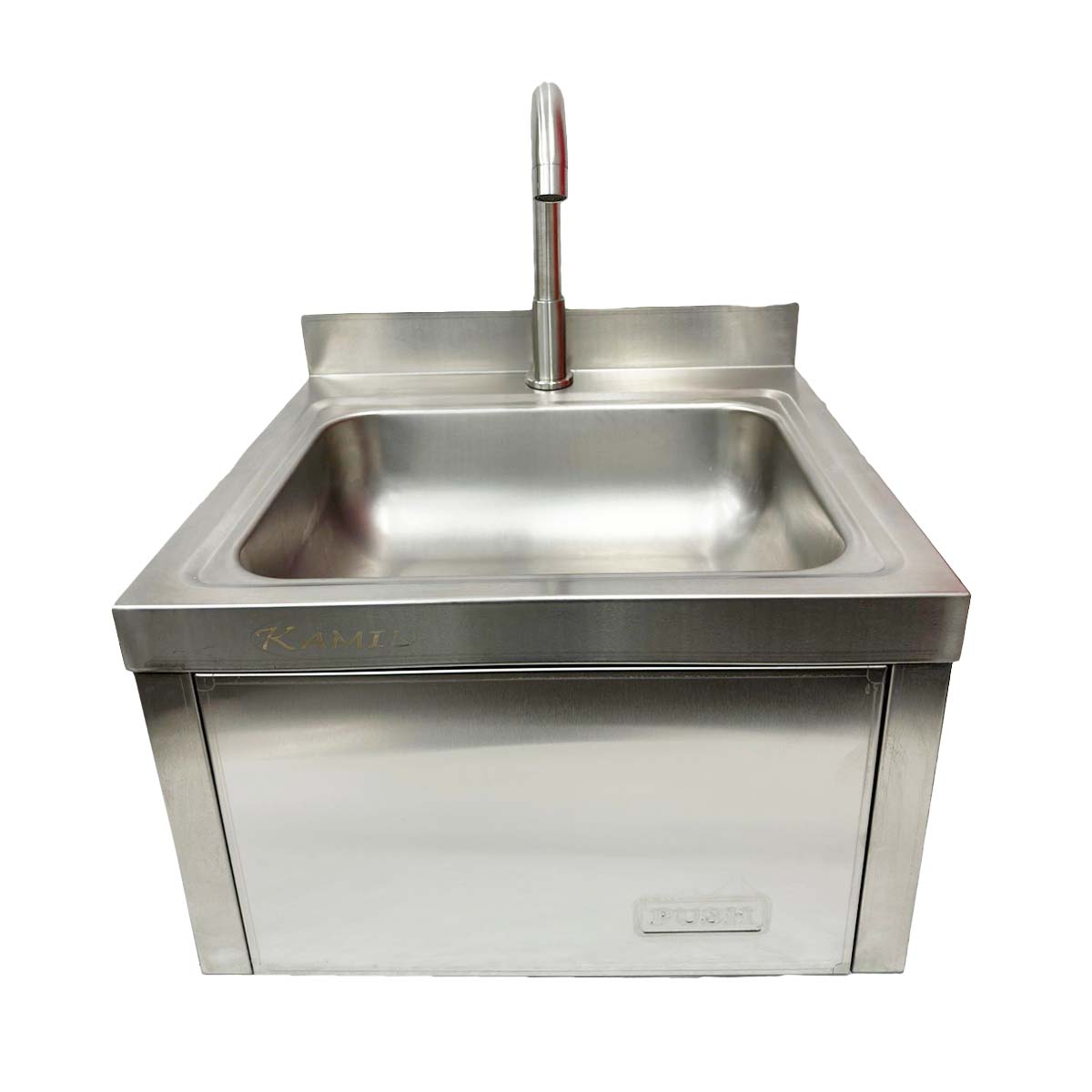 This completely hands free sink is operated by your knee, making it hygienic to use and germs from your hands don’t get onto any taps or buttons, reducing cross contamination and increasing hygiene. Hands free sinks are perfect for use in environments where food contamination is likely, such as butchers or commercial kitchens. This stainless steel sink from KAMIL is a high quality and easy to clean sink. The hands free hand sink is made of durable 204 series stainless steel. A gooseneck faucet is pre-installed and it also includes a high backsplash. A must have for any catering establishment.