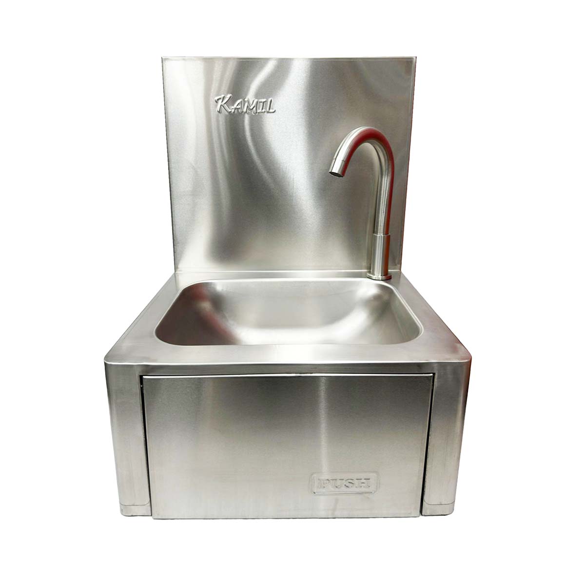 Its KAMIL hands-free professional hand sink helps lower the possibility of cross contamination in your busy commercial kitchen or industrial setting because of its knee-operated design. The sturdy 204 series stainless steel used to construct the hands-free hand sink. Pre-installed gooseneck faucet and high backsplash are also included. a requirement for every catering business.